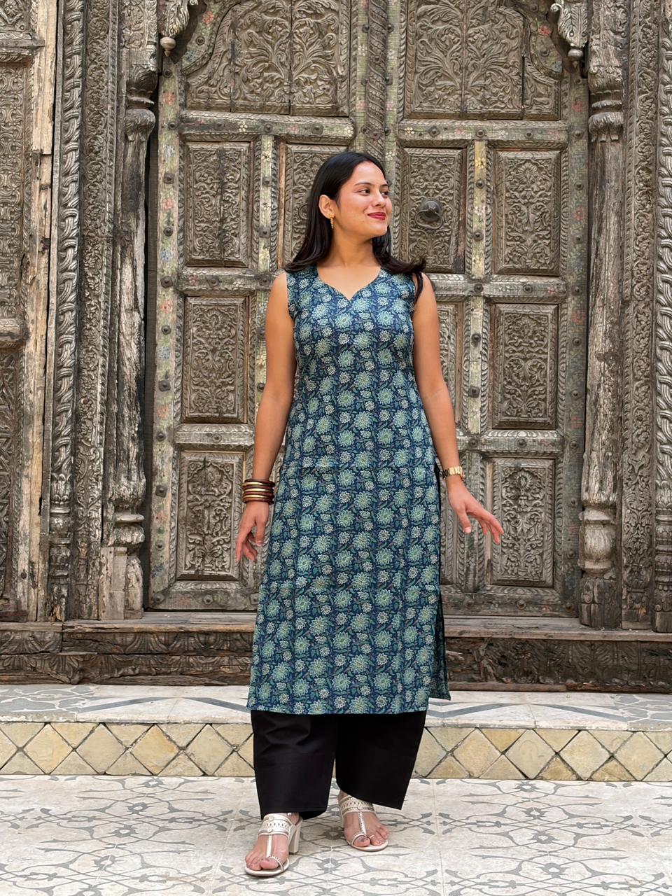 This sleeveless A-line kurti set showcases a beautiful ethnic-inspired print that adds effortless charm to your everyday wardrobe. Designed for comfort and versatility, the kurti features a flattering V-neckline and a flowy silhouette, paired with straight-fit pants for a clean, modern look. Ideal for casual wear, workdays, or relaxed gatherings, this ensemble offers a perfect balance of style and ease.